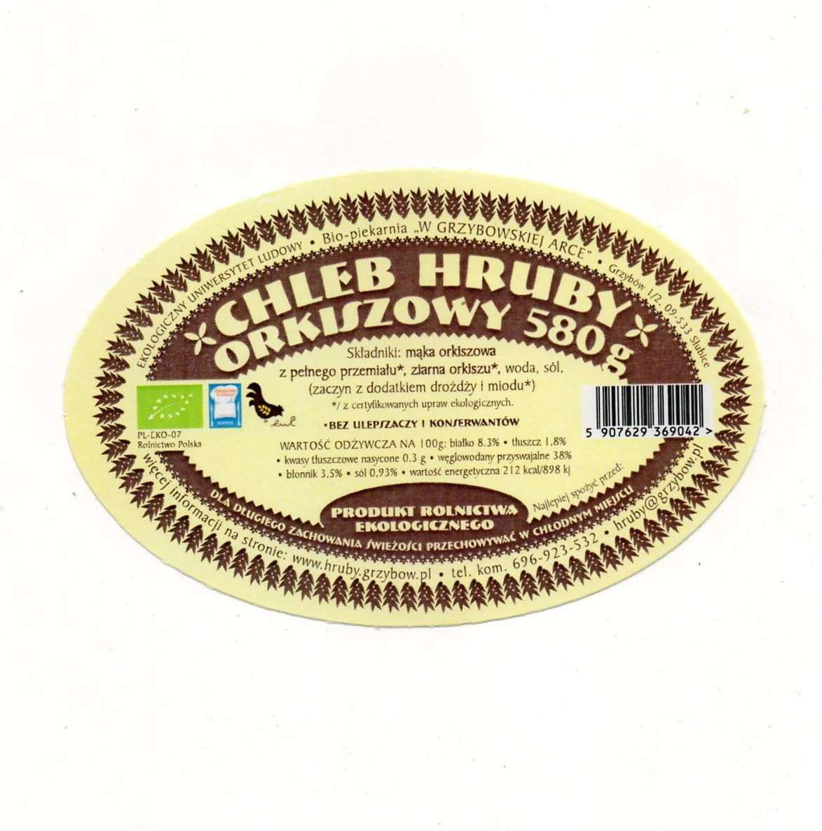 W skład chleba wchodzi wyłącznie ziarno orkiszu z upraw ekologicznych potwierdzonych certyfikatem, Mąka orkiszowa TYP 2000. Bez polepszaczy i konserwantów.